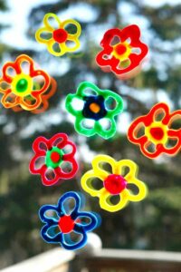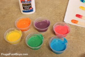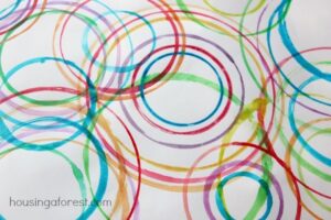Los materiales que serán necesarios son: tapas blancas de plástico (de cualquier tamaño o figura deseada), colorante de comida, pega líquida y palillos de dientes. Primero dejas que tu nene llene la tapa plástica de pega con una cantidad razonable para que cubra el fondo de la tapa. Luego les das el colorante de comida y dejas que suelten dos o tres gotas de colores diferentes en la pega. Ahora vienen los palillos de dientes, con los que tus nenes moverán las gotas de colores por la pega creando el diseño bien “groovy” que desean. Al finalizar dejen que se seque la pega y luego la despegan de la tapa para ver el proyecto final.