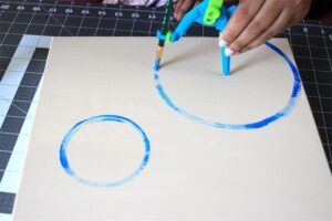 Los materiales necesarios para esta actividad son relativamente básicos: papel blanco, pintura regular para niños y un compás (instrumento matemático). Los nenes toman un papel en blanco y usan el compás como si fuera el pincel. La punta del lápiz, o lo que decidan poner en la segunda pata del compás, la sumergen en el color deseado y los nenes forman círculo tras círculo, cada uno de un color diferente llenando la página.
