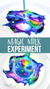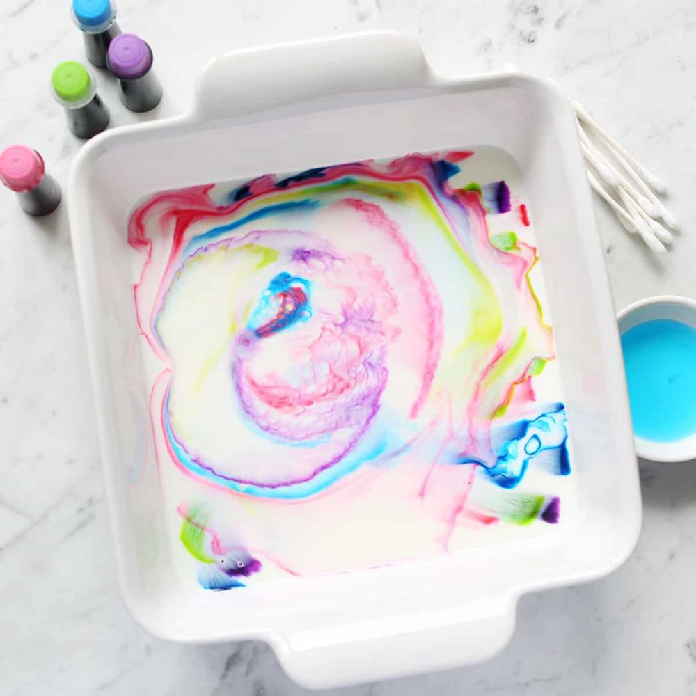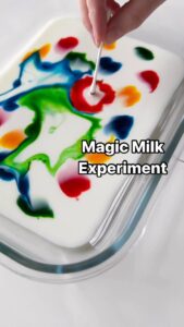 Esta actividad hace que la pintura baile ante los ojos de tus nenes. Los materiales necesarios son: leche, jabón de lavar platos, un plato y colorante de comida. Primero echen una capa finita de leche en el plato y luego le echan varias gotas de colorante (usen diferentes colores). Ya al haber hecho esto, echen una o dos gotas de jabón de lavar platos en el centro de las manchas de colorante y vean aparecer la magia