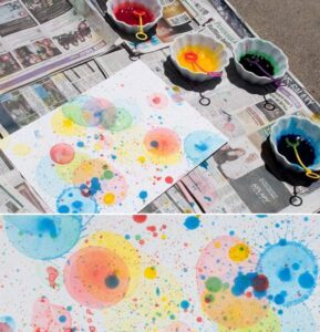 Esta es la más complicada de todas. Los materiales necesarios son: “baking soda”, agua, vinagre, colorante de comida, algún instrumento para mezclar, pipetas y pinceles. Primero echan un octavo (1/8) de baking soda en varios vasitos, le echan a cada uno el colorante deseado y luego le echan un cuarto (1/4) de agua y baten. Consigan un papel grueso que no se vaya a romper cuando los nenes comiencen a pintar con los pinceles. Ya cuando los nenes hayan finalizado pintar el papel completo entonces se les entrega una pipeta y un vasito con vinagre. Con la pipeta echen gotas por el papel pintado y vean como los colores se expanden y se mezclan entre sí. (Los materiales son seguros, pero se urge que los nenes no se toquen los ojos al finalizar tal actividad.)