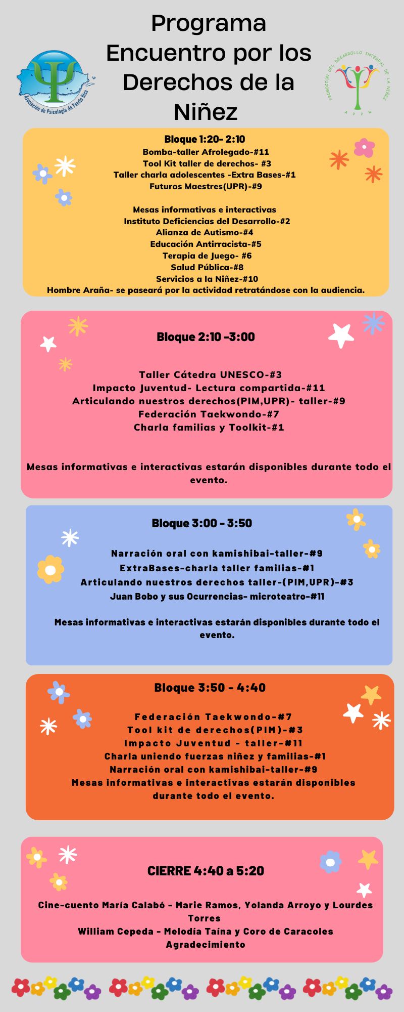 Se promoverá la educación sobre los Derechos de la Niñez a través de: actividades, charlas, talleres, mesas informativas, mini shows y demostraciones a niñ@s, adolescentes y toda la familia y meriendas para los asistentes. Tendrán un sorteo de literatura infantil.